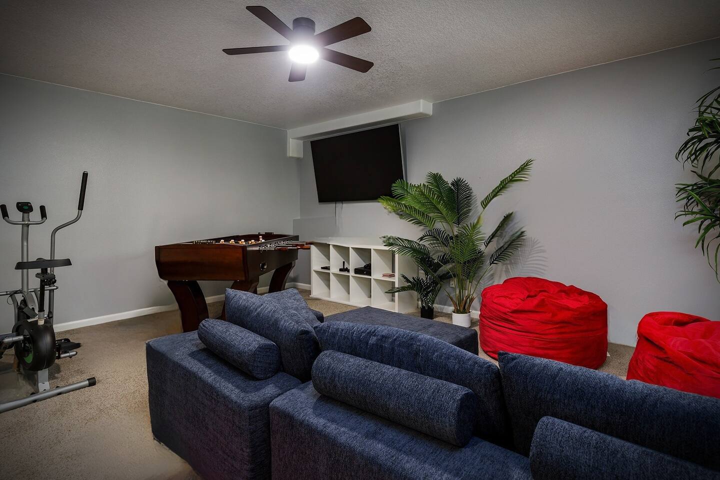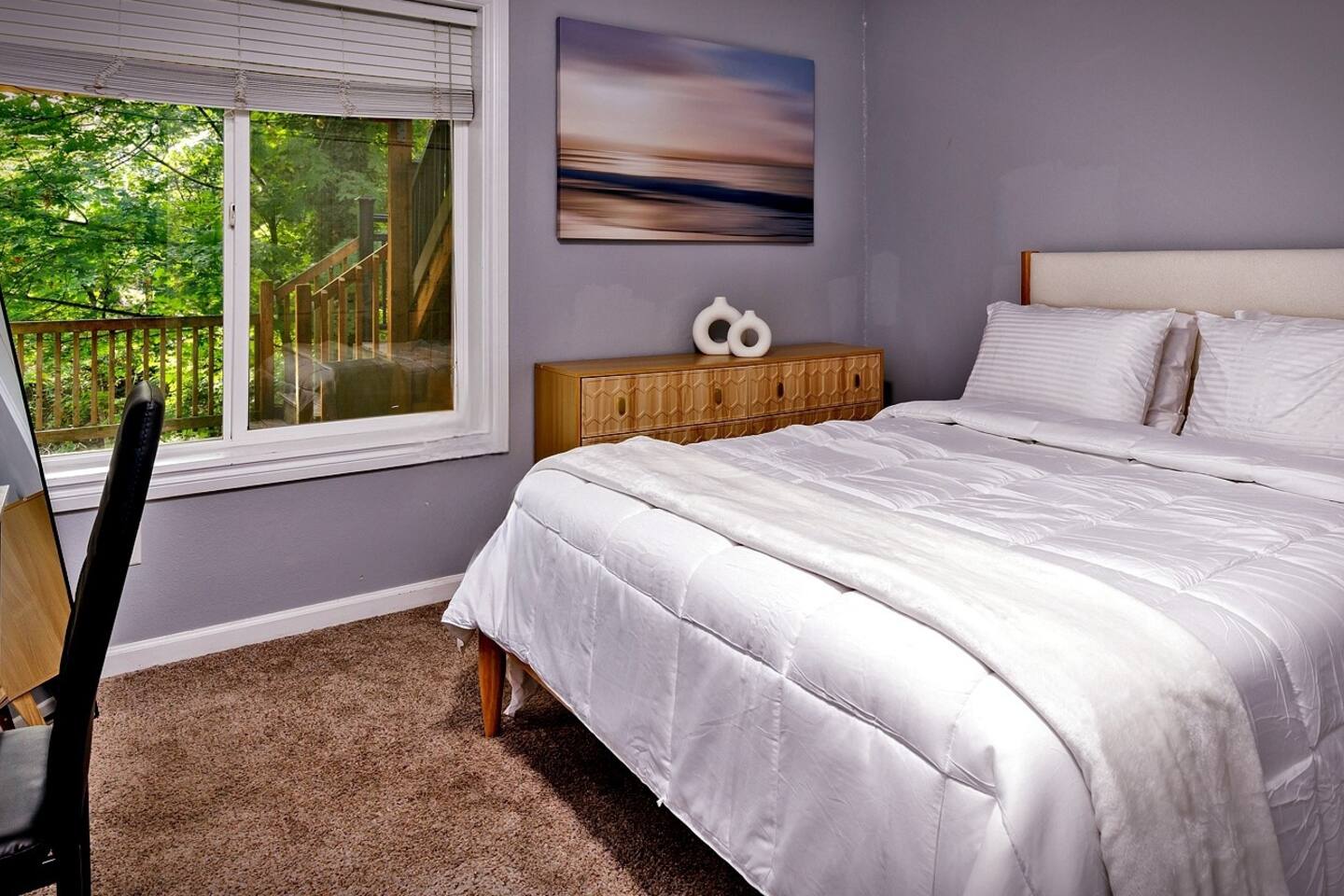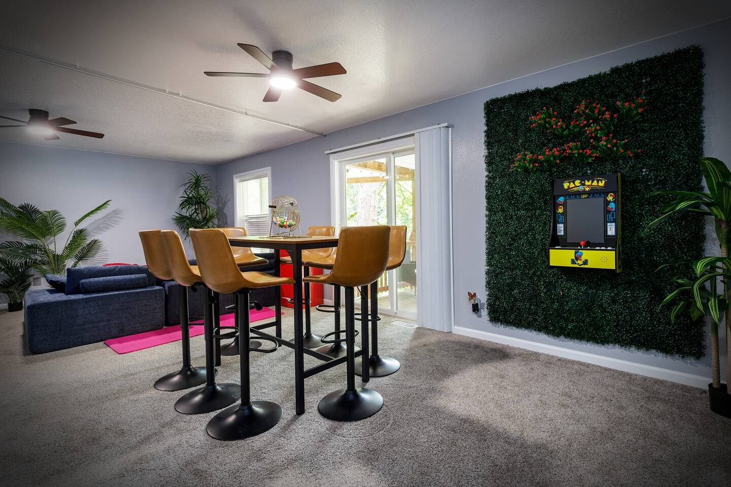 This listing is for the downstairs unit only of a duplex-style home. The upstairs unit is rented separately. Each unit has its own private entrance, and there are no shared indoor spaces. Enter this unique, contemporary furnished suite on the side of the house. It creatively boasts a hip, cozy atmosphere with several areas to hang-out, relax, play, study or work. We offer 3 private bedrooms and one open plan bedroom (separated off the LR/DR with a screen) w queen beds. There is an additional pull-out double futon with one full bathroom that includes a tub, shower and in-unit washer/dryer. Enjoy the spacious backyard, lower deck experience for bbq, with plenty of room and outdoor furniture with gorgeous views of lush greenery, in addition to the garden/fire pit. The game room includes: oversized bean bag chairs, a flatscreen TV, XBox, PacMan, Foose ball and board games - something for every age! Exercise bike and yoga matt for stretching and work-outs. We also offer 2 desks in the bedrooms for convenience and private work environments. What you’ll have access to: • Entire downstairs unit • All bedrooms, beds, and amenities shown in photos • Private entrance • No shared indoor spaces Please note: The upstairs unit may be occupied by another guest during your stay and is not part of this reservation.