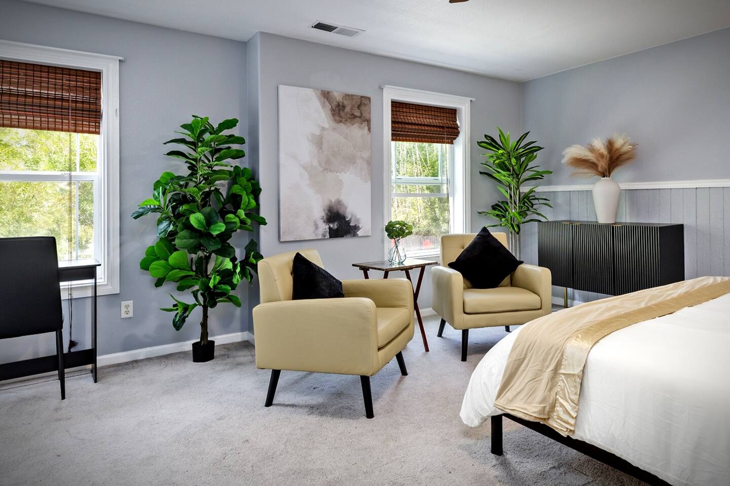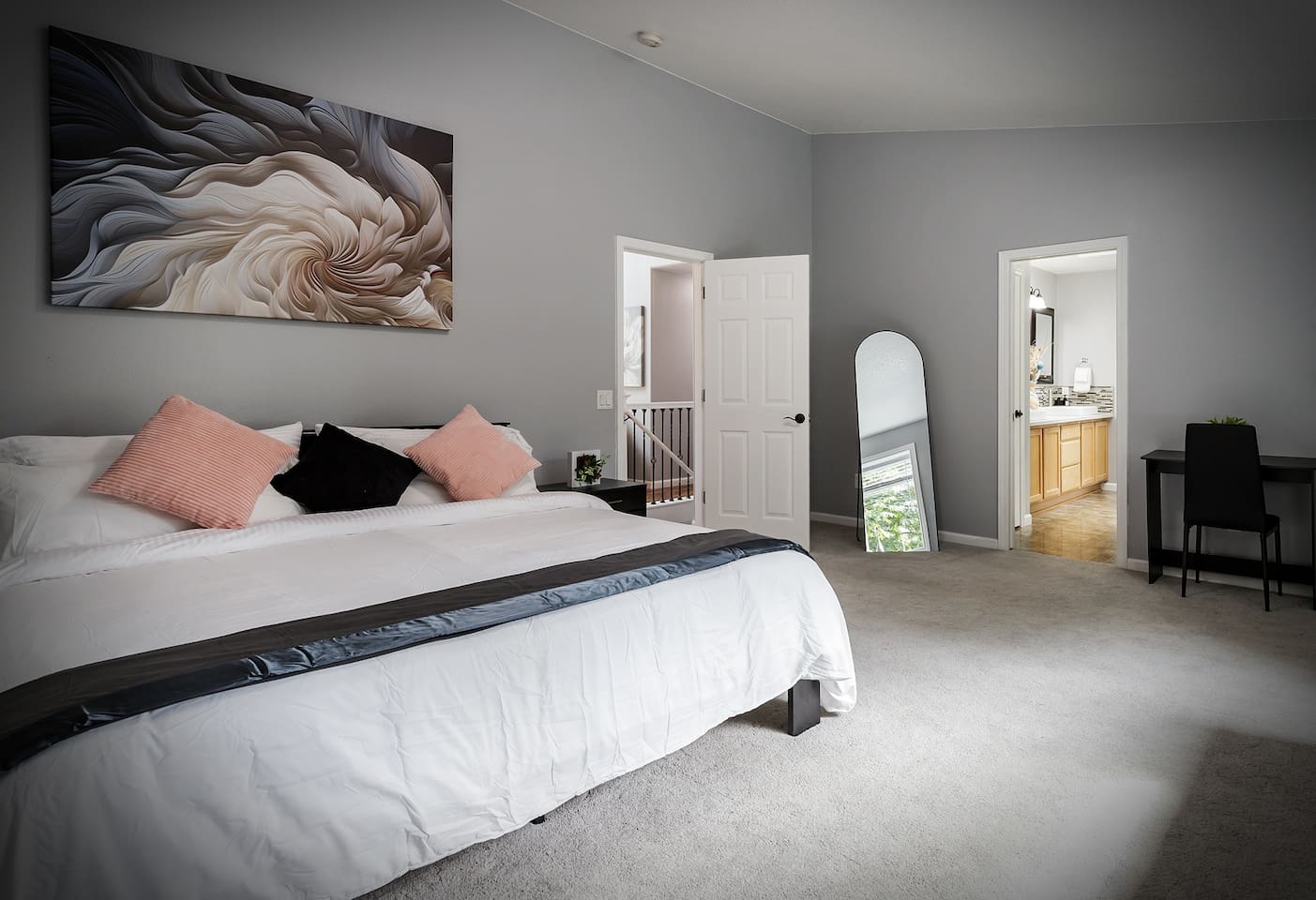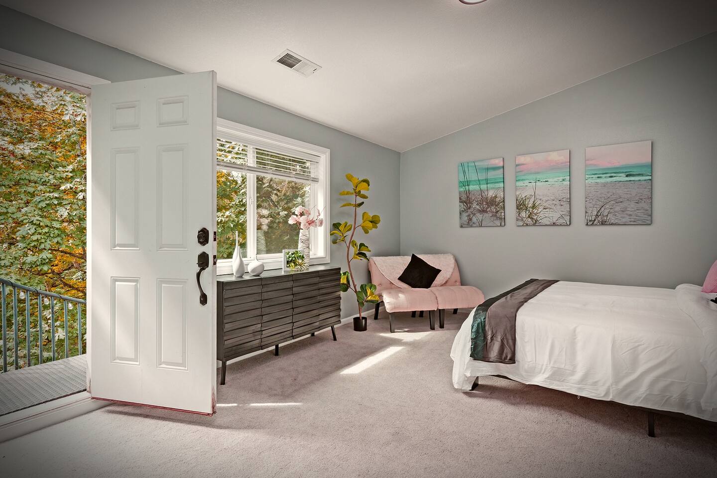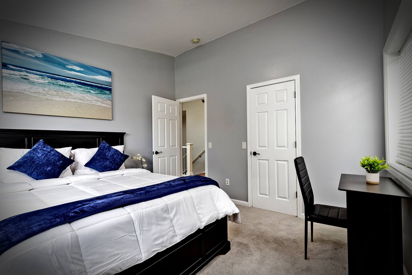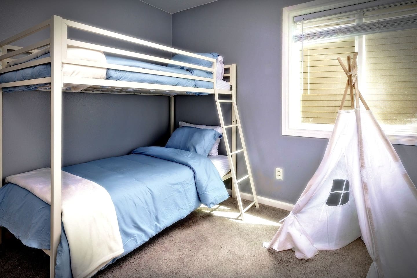 This spacious upper-level unit is ideal for families and multi-generational stays seeking comfort, space, and a relaxing retreat. The upper unit features an open-plan kitchen, living, dining, and family room, along with thoughtfully designed spaces for work or relaxation. Guests will find three desks located in private bedrooms, making it easy to work from home or school during your stay. Unwind in comfort in one of our two king bedrooms, relax in the spa-style soaking tub under the upstairs skylight, or retreat to your own private space for quiet time. For families, we offer two bunk beds for children, along with a fun teepee play area. Teens and adults can relax with movies in the living room or enjoy time on the private upper deck. This home is designed to offer variety, comfort, and space — all within the upper unit only. What You’ll Have Access To ✔ Entire upstairs unit ✔ All beds and amenities listed for the upper level ✔ Spa-style soaking tub in the primary suite ✔ Private entrance ✔ No shared indoor areas Important Disclosure (Please Read) The downstairs unit is occupied by a separate guest The downstairs space is not part of this reservation There are no shared indoor areas between units If you are looking for exclusive access to both levels, please inquire about our entire-home listing, subject to availability.